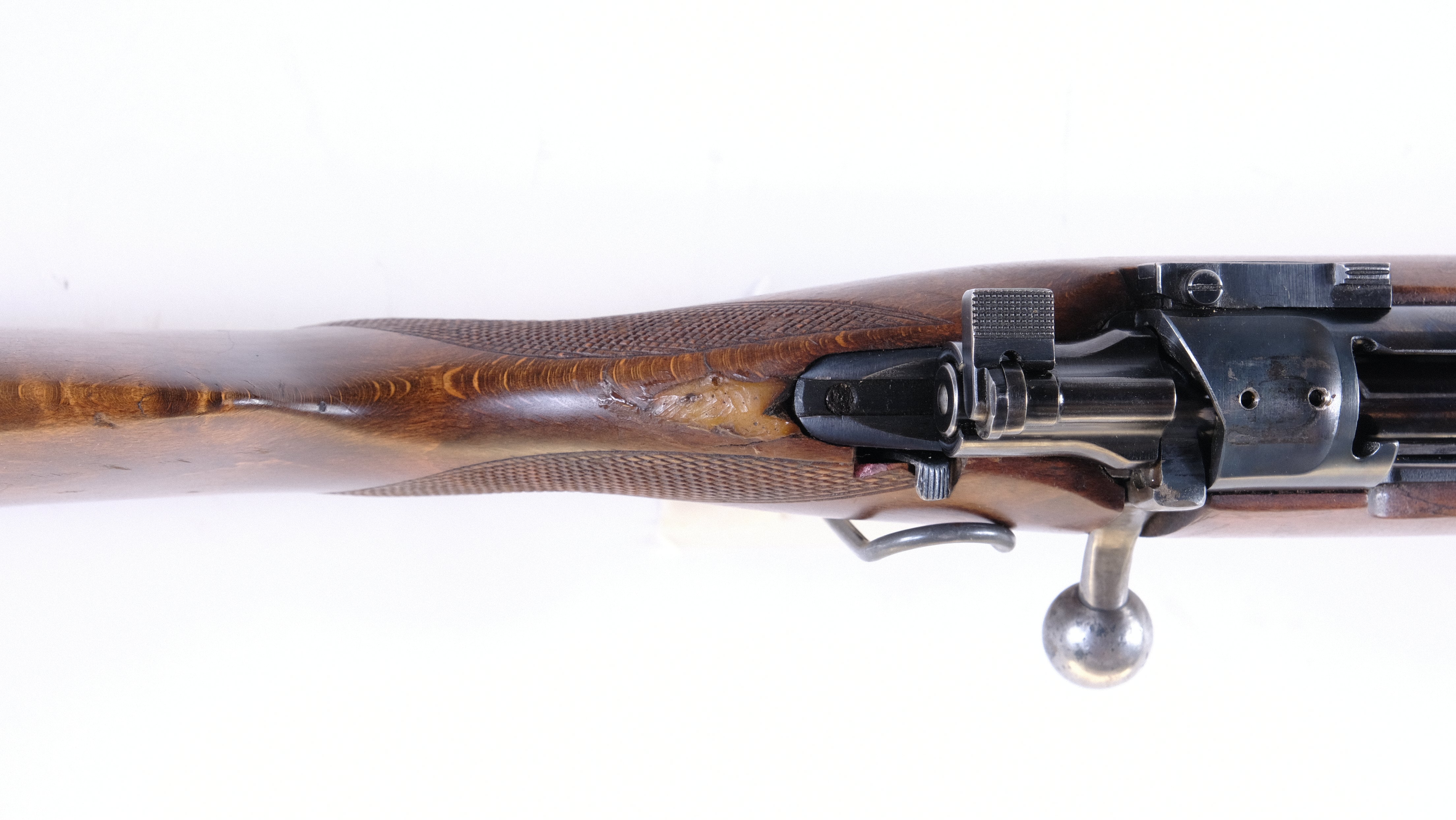 • Stock has a poorly repaired wood chip behind the tang